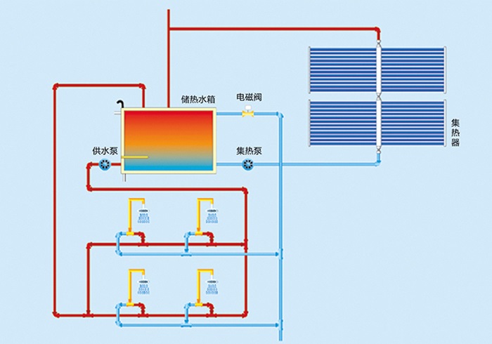 室外(屋面、空地等)安裝大面積的太陽能集熱器矩陣吸收太陽能量,并將光能轉化成熱能后集中儲存在儲熱水箱 內,通過儲熱水箱向各個用水點供水的系統。