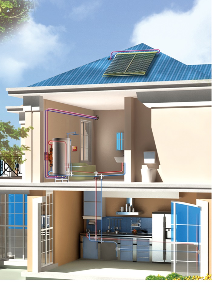 本系統采用天豐分體式太陽能熱水機,吸熱部件(太陽能集熱器)與儲熱部件(水箱)分離式安裝,集熱器安裝于屋面(或陽臺、南立面墻等)位置,儲熱部件(水箱)安裝于室內設備間,然后通過管路把太陽集熱器、水箱和室內衛生間、廚房等用熱設備相連接的一種分戶集熱、分戶儲熱式太陽能熱水系統,整個系統為承壓式運行,間接加熱。